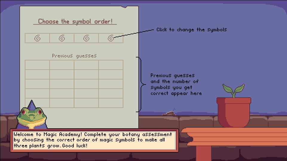 To play, click the symbols at the top to toggle between three different choices. Press submit and you'll find out how many were in the right position in the sequence. Try and figure out the correct sequence in five guesses to get the plants to grow. The sequence is randomised each time for the three plants.